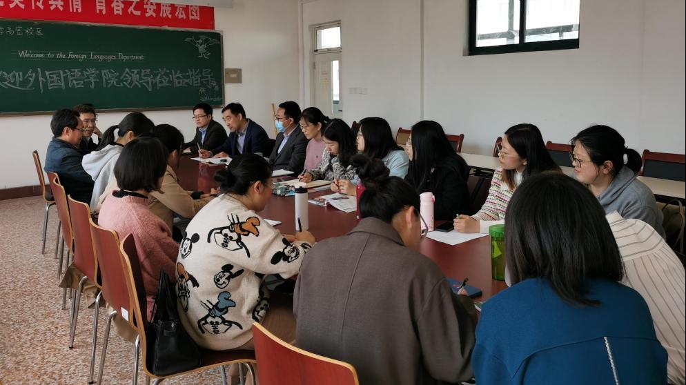 随后,尹洪山一行与校区外语系教师进行座谈,聆听外语系教师教学、教研、科研中的困惑并一一解答。尹洪山鼓励老师们在备好课、上好课的同时,积极提升自身的学科素养,每一位老师都要有一门拿手的课程;提高信息素养,运用信息化手段辅助教学;提高科研素养、教研素养,通过科研成果、教研成果反哺教学。同时,尹洪山鼓励外语系教师积极进行教学反思,创新教学形式,推进专业建设,助力校区大学英语教学改革。