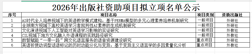 经项目负责人申报、专家匿名评审,现将2026年出版社资助项目拟立项名单公示如下: